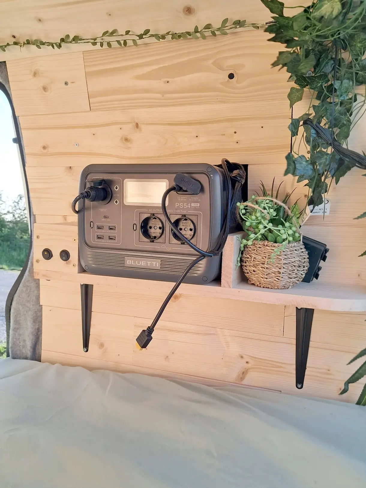 Une batterie bluetti alimentée via panneau solaire et le moteur du véhicule, permettant de brancher vos appareils 12V et 230V à la force du soleil