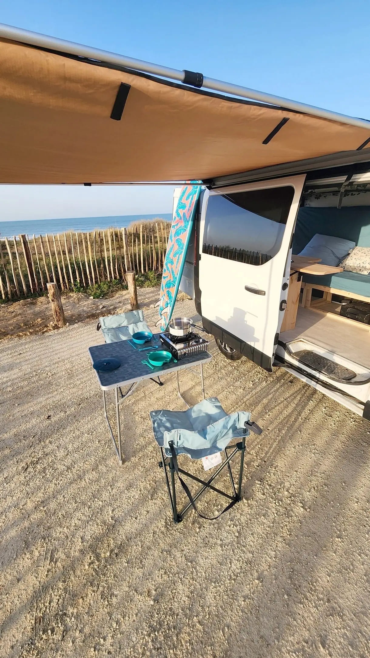 Le van est équipé d'un store latéral, d'une table pliante et de ses deux chaises pour profiter de cocktails à l'abri du soleil.
