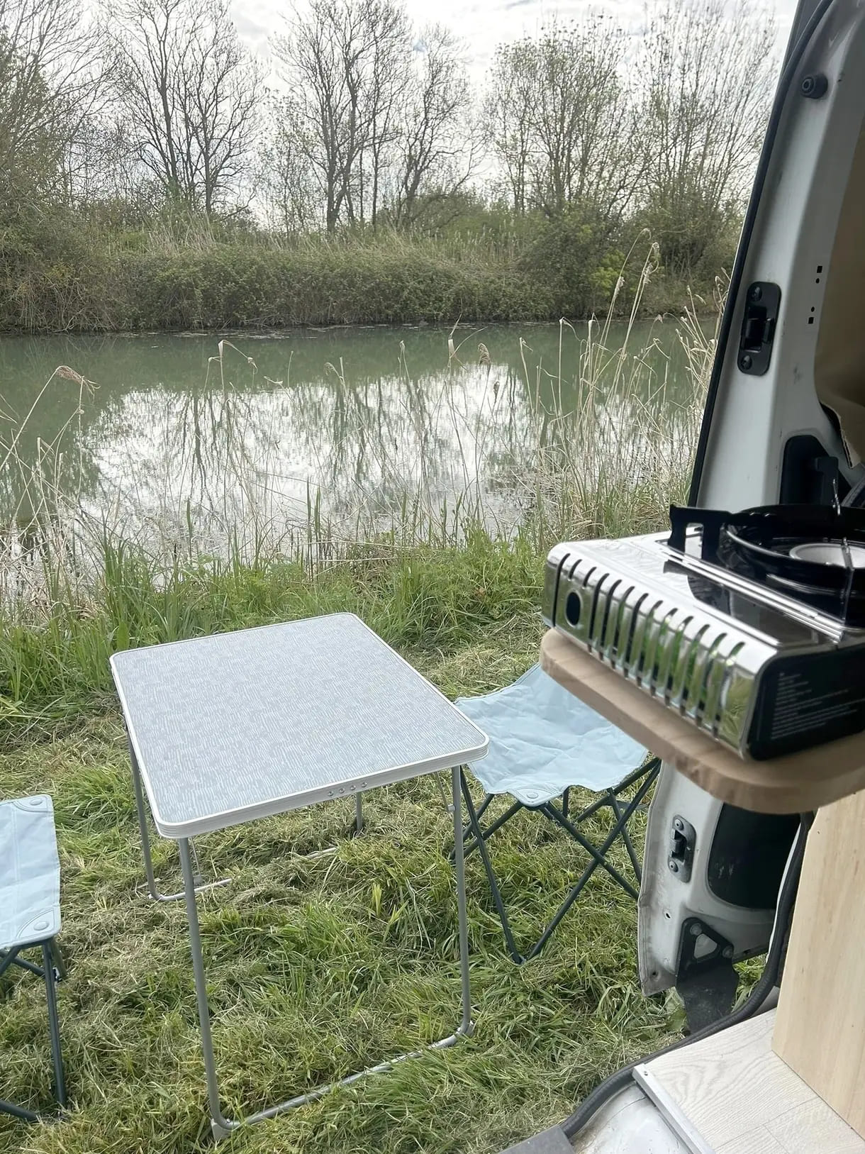 Le van est équipé d'un store latéral, d'une table pliante et de ses deux chaises pour profiter de cocktails à l'abri du soleil.