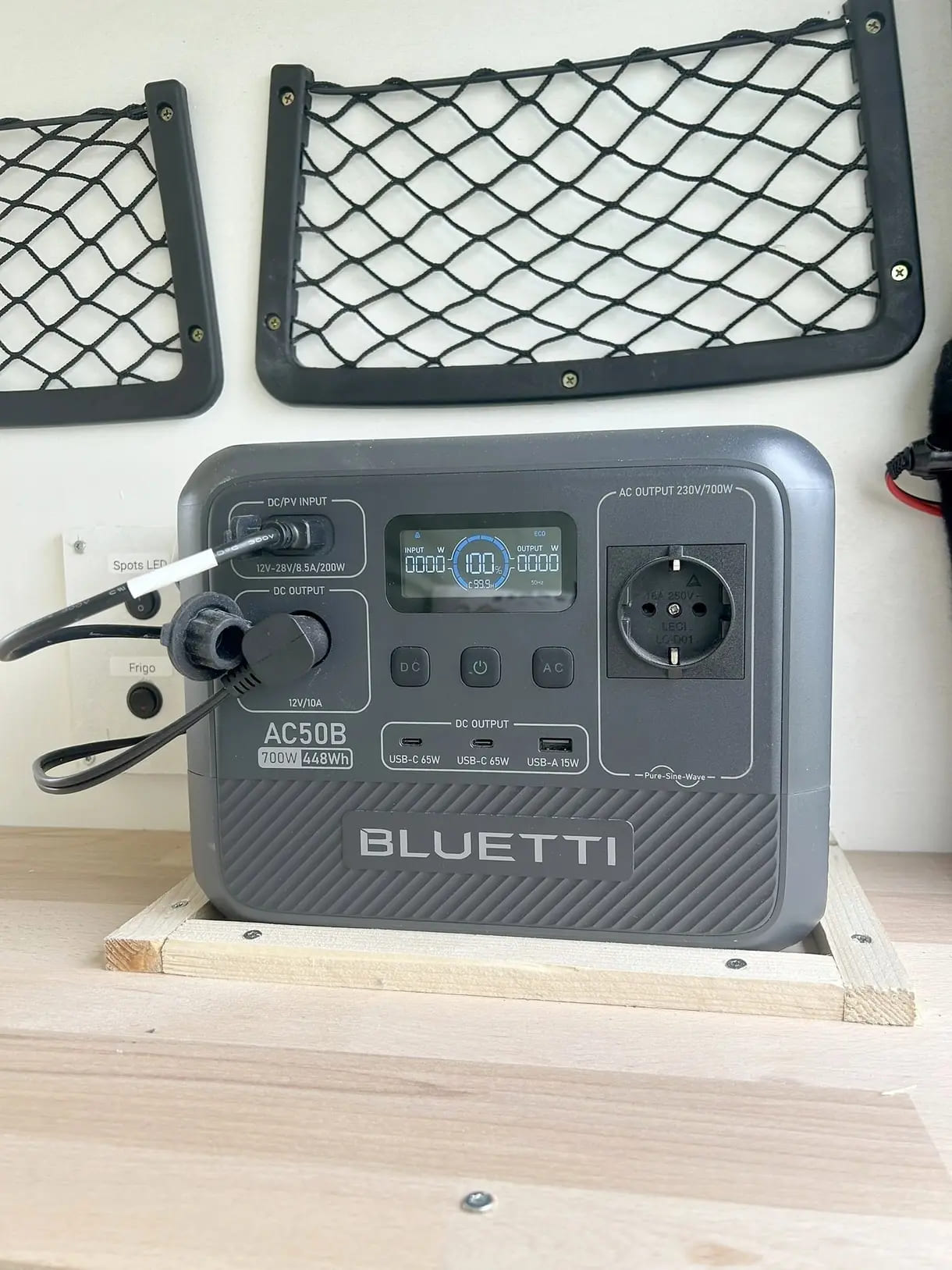 Une batterie bluetti alimentée par un panneau solaire et le moteur du véhicule, permettant de brancher vos appareils 12V et 230V à la force du soleil